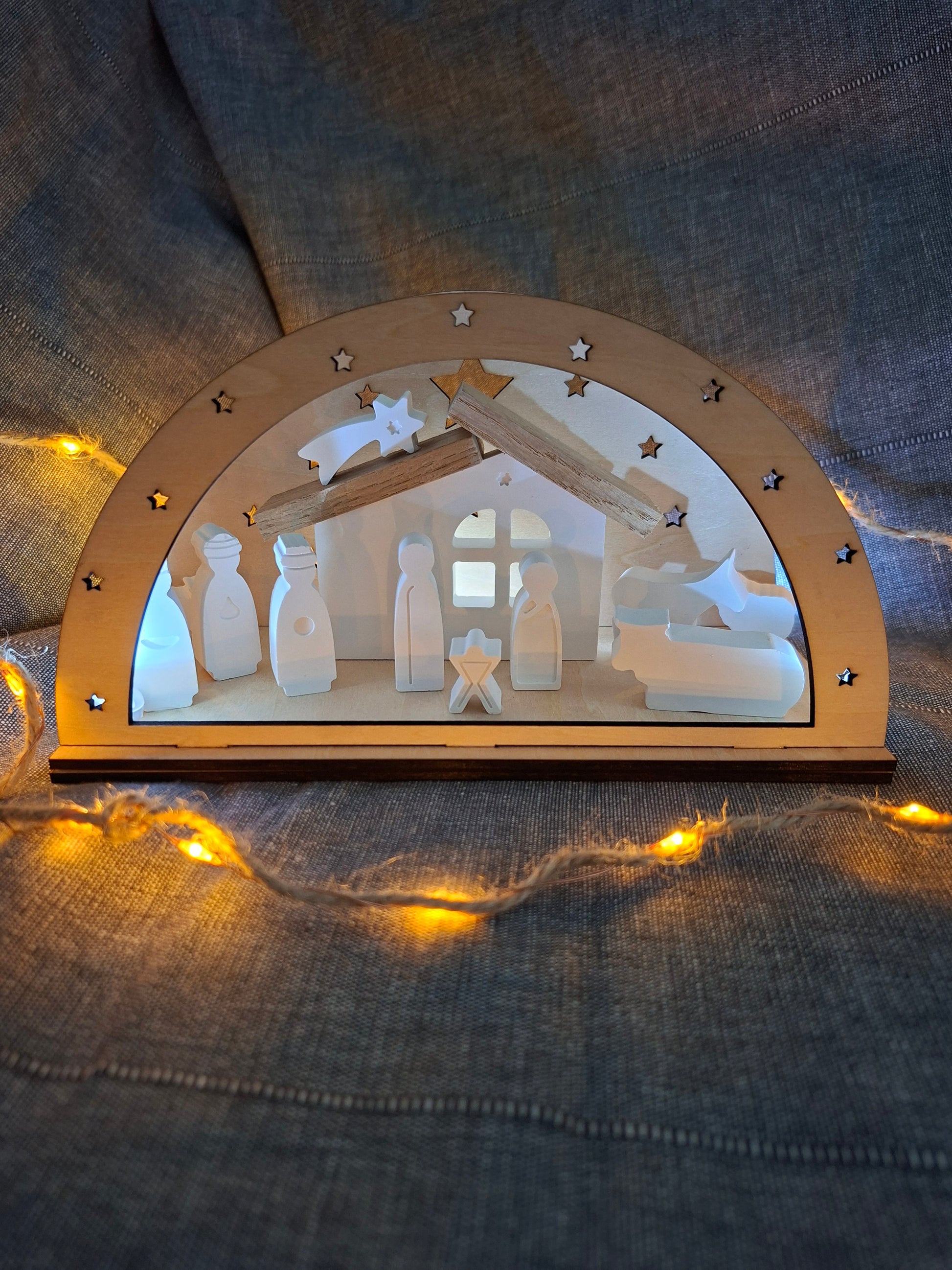 Der Holzbogen und das Licht lassen die Krippe zu einem schönen Weihnachtsartikel strahlen 🤩